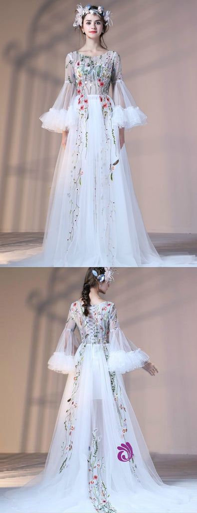 Elegant White Tulle A-Line Prom Dresses, Long Sleeve Applique Round Neckline Prom Dresses, KX198 Elegant White Tulle A-Line Prom Dresses, Long Sleeve Applique Round Neckline Prom Dresses, KX198