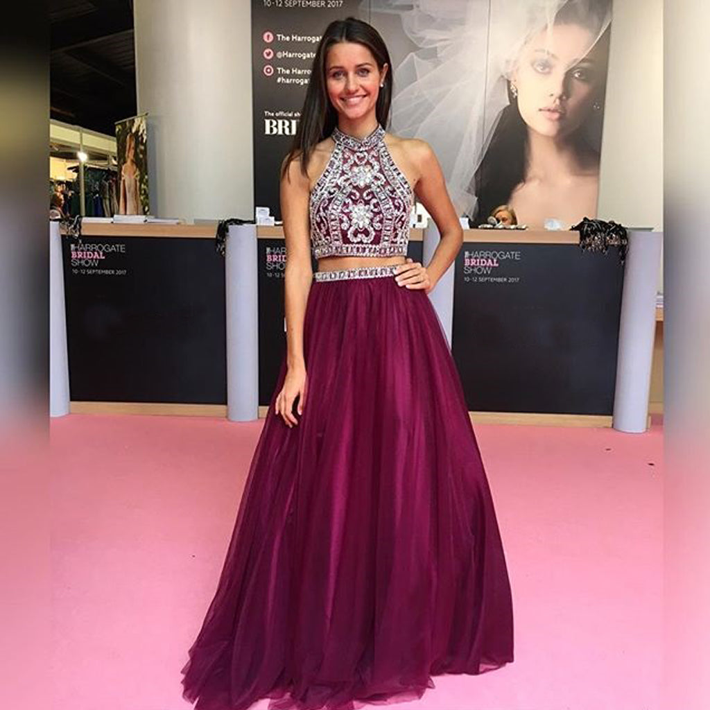 Elegant Two Pieces Open-Back Tulle A-Line Beaded Prom Dress, FC435