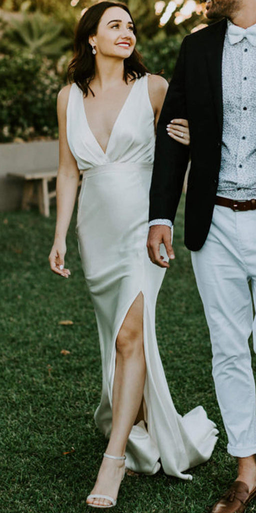 Simple Deep V-Neck Elastic Satin Backless Slit Wedding Dresses, FC1681
