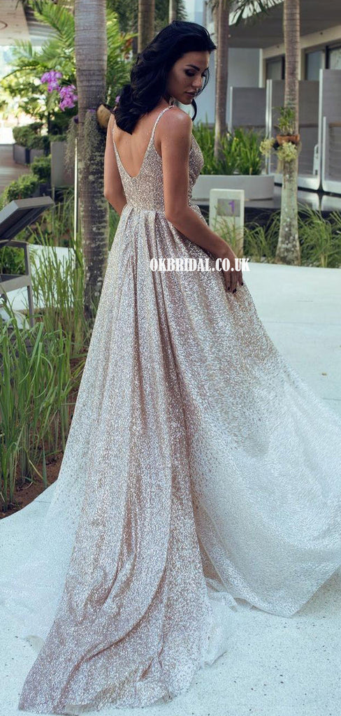 Sparkle A-line Spaghetti Straps V-neck Backless Prom Dresses, FC6026
