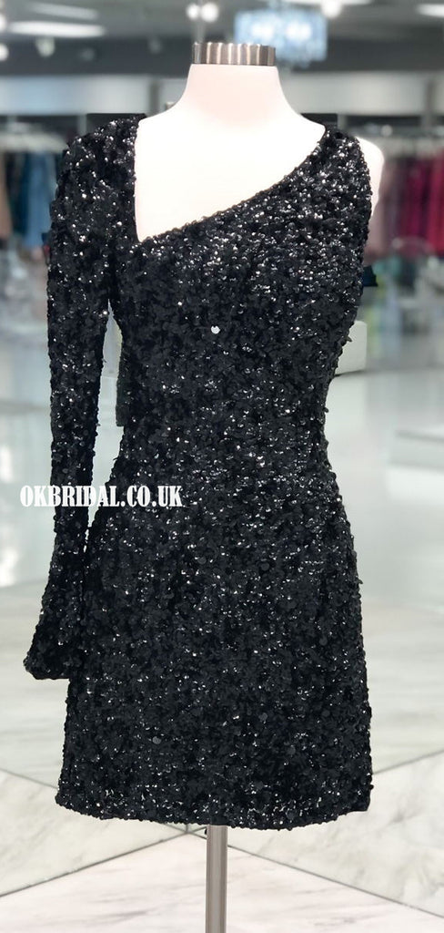 Sparkle Black Sequin Long Sleeve Beaded Homecoming Dress, FC6139