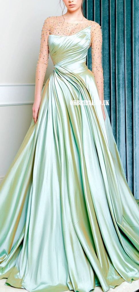 Long Sleeves A-line Satin Honest Tulle Beaded Prom Dresses, FC5840