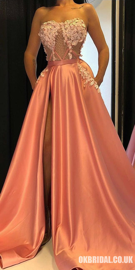 Charming Sweetheart A-Line Satin Backless Slit Applique Prom Dresses, FC2043
