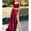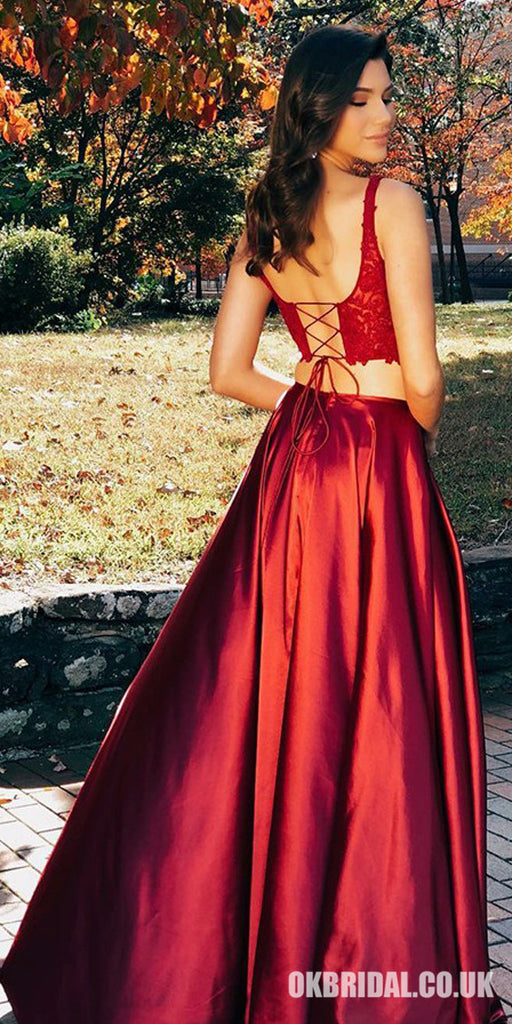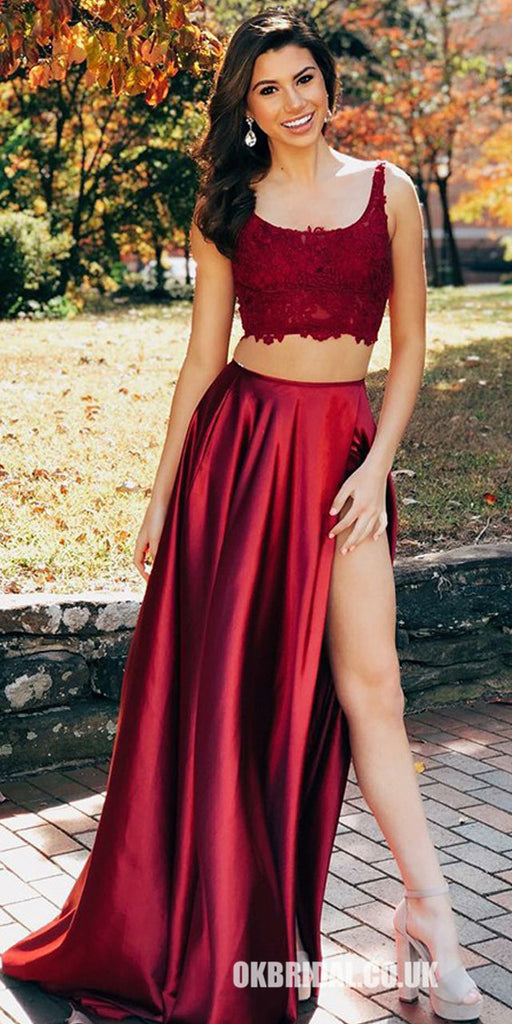 Special Two Pieces Satin A-line Slit Lace Top Backless Prom Dresses, FC2037