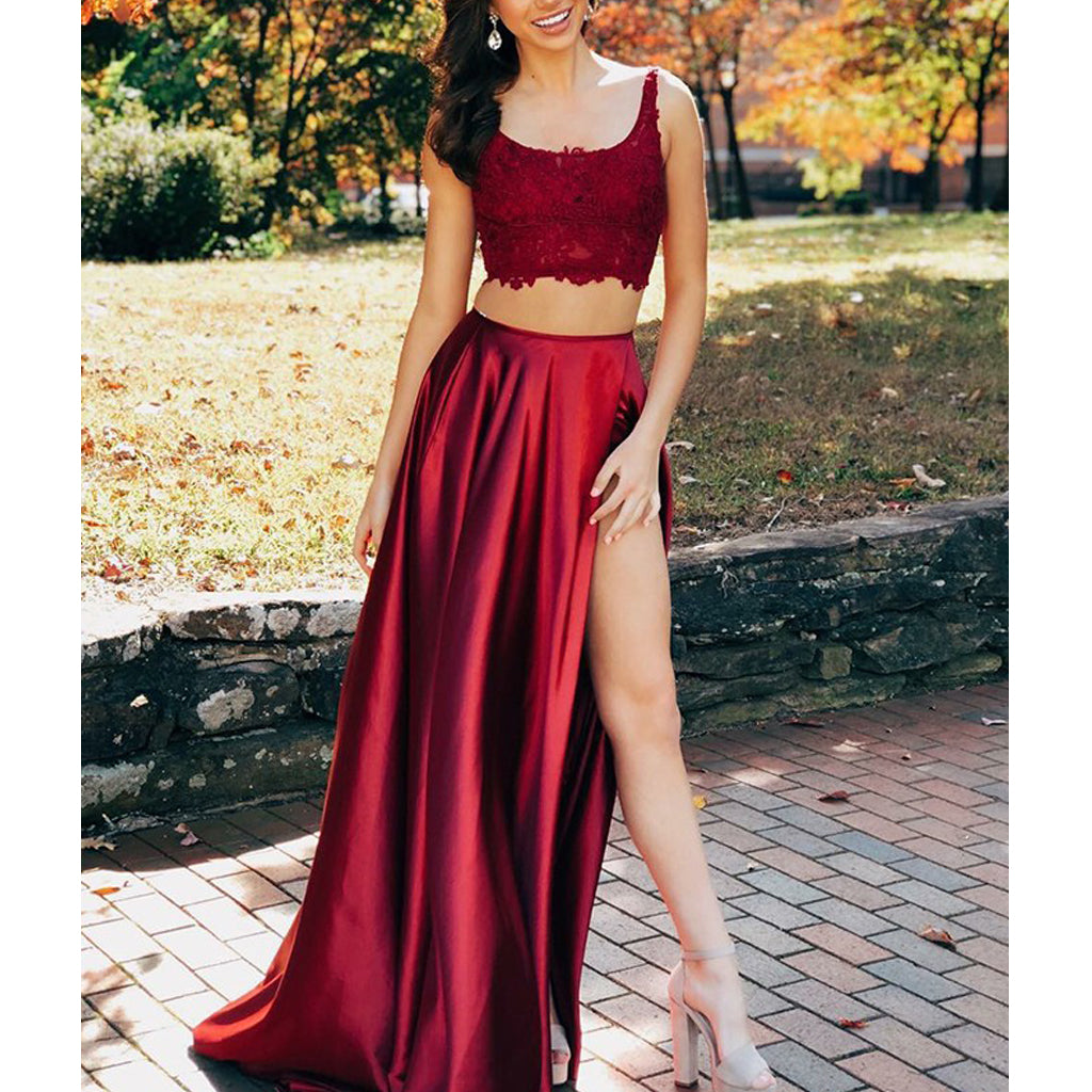 Special Two Pieces Satin A-line Slit Lace Top Backless Prom Dresses, FC2037 Special Two Pieces Satin A-line Slit Lace Top Backless Prom Dresses, FC2037