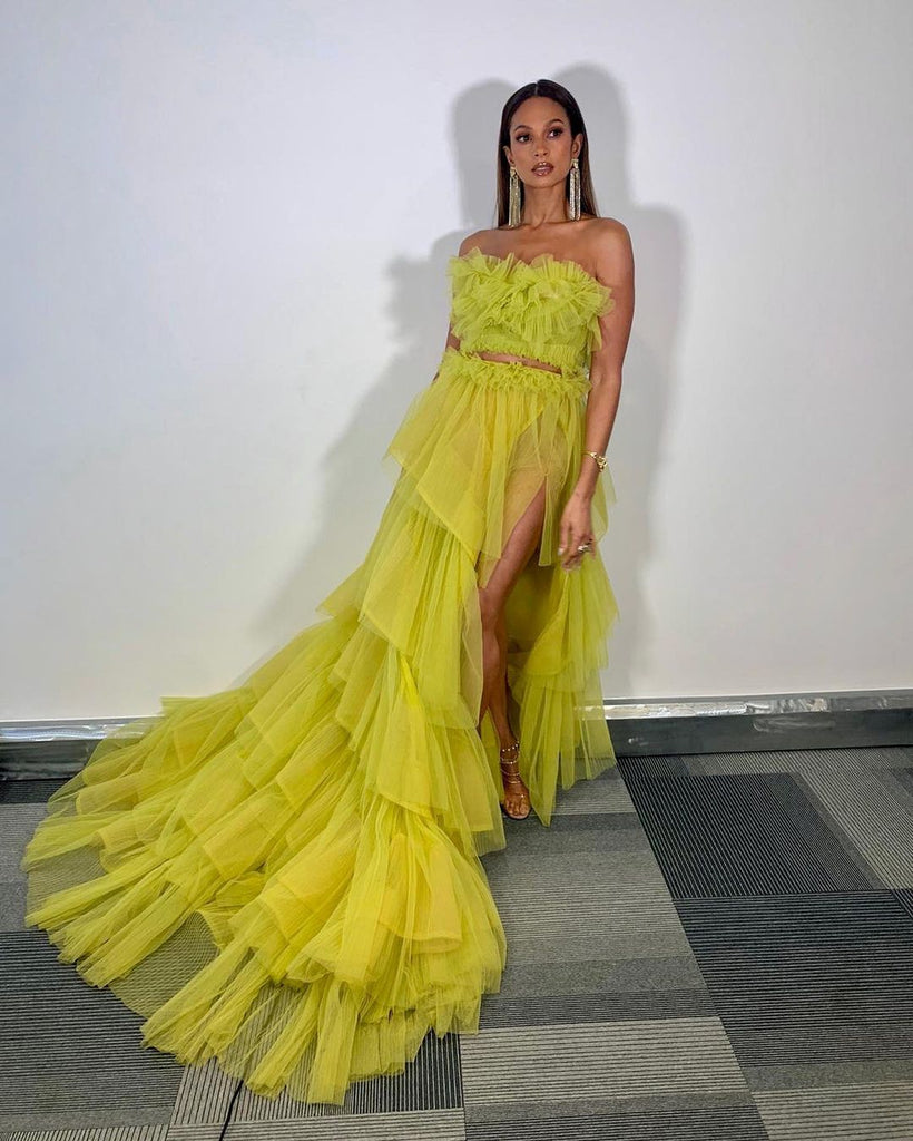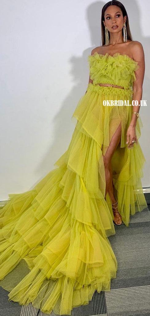 Charming Two Pieces Tulle A-line Sexy Slit Prom Dresses, FC5388