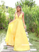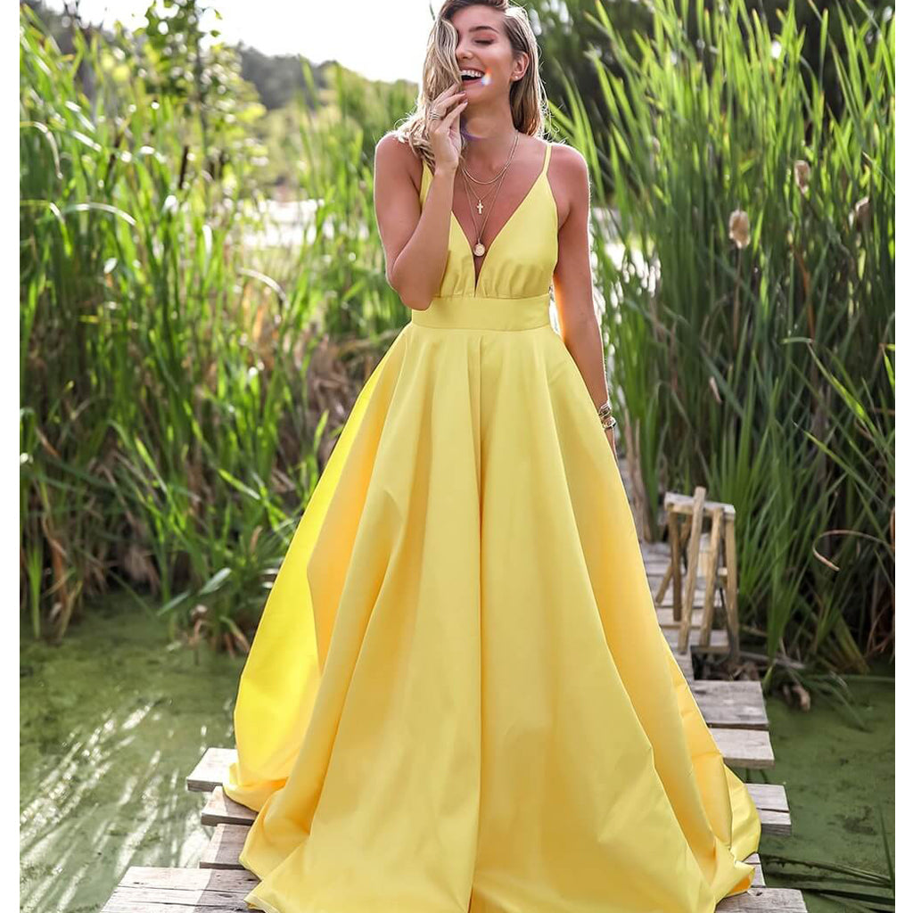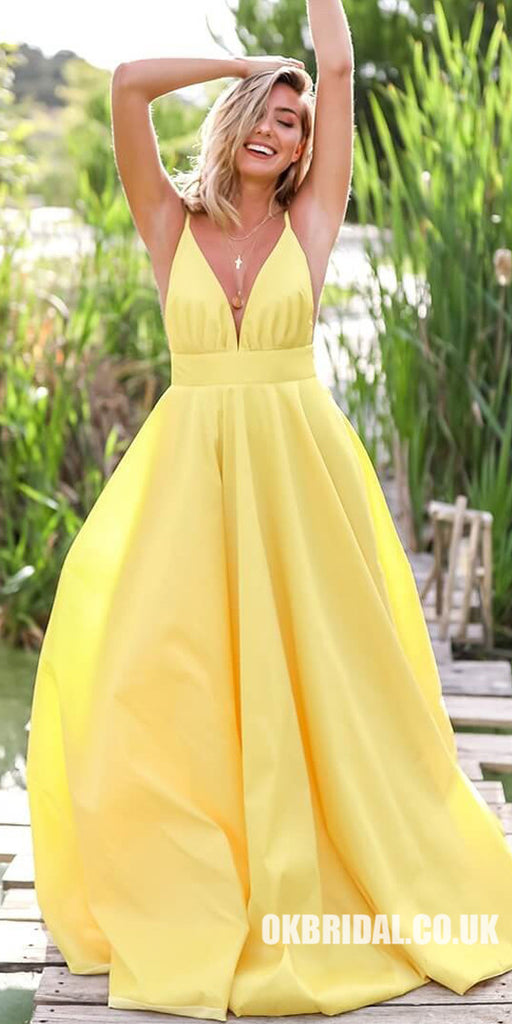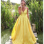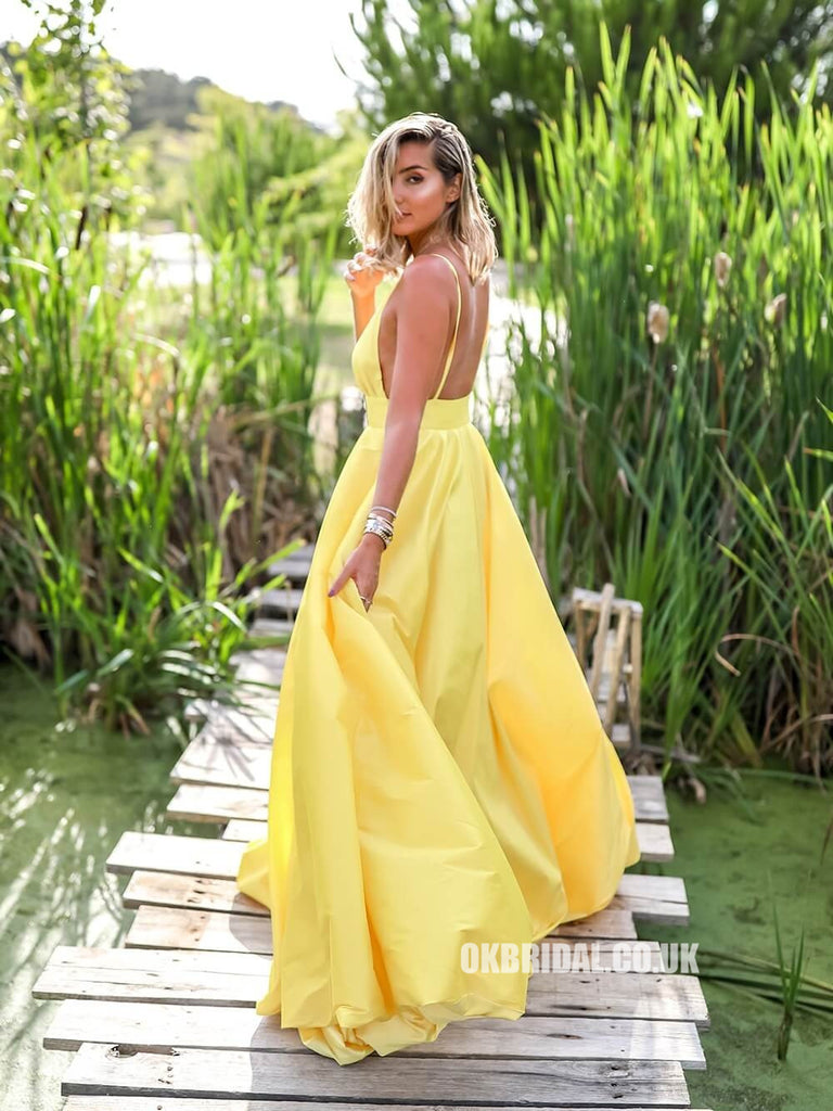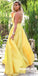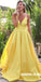 Yellow Spaghetti Straps A-line Deep V-neck Backless Satin Long Prom Dresses, FC2299