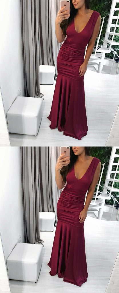 Simple Pleated Mermaid Sleeveless V-Neck Elastic Satin Prom Dress, FC505