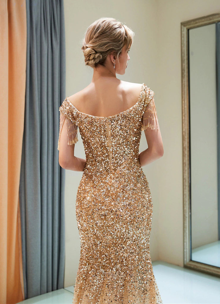 Sparkly Sequin Cap Sleeve Tulle Mermaid Backless Beaded Prom Dress, FC1777