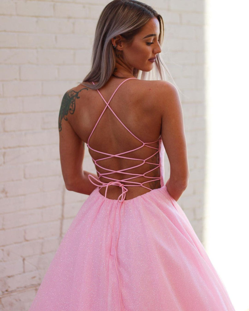 Pink Sparkle Spaghetti Straps A-line Backless Prom Dresses, FC6491