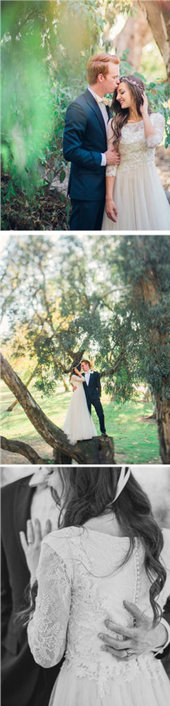 Scoop Neck 3/4 Sleeve Long A-line Lace Tulle Wedding Dresses, WD0162