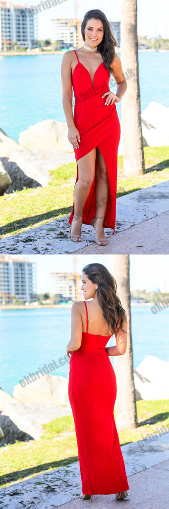 New Arrival Red Backless Sheath Prom Dresses, Spaghetti Straps Deep V-Neck Party Dresses, KX1411